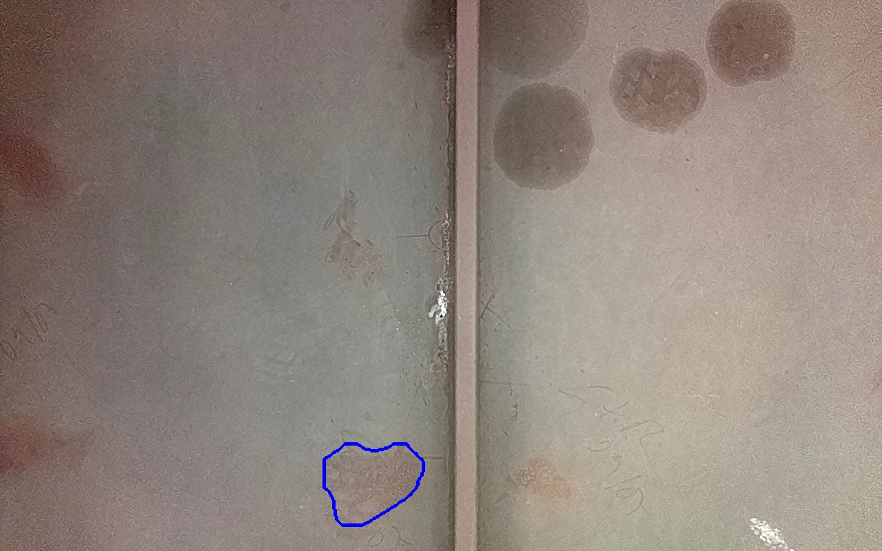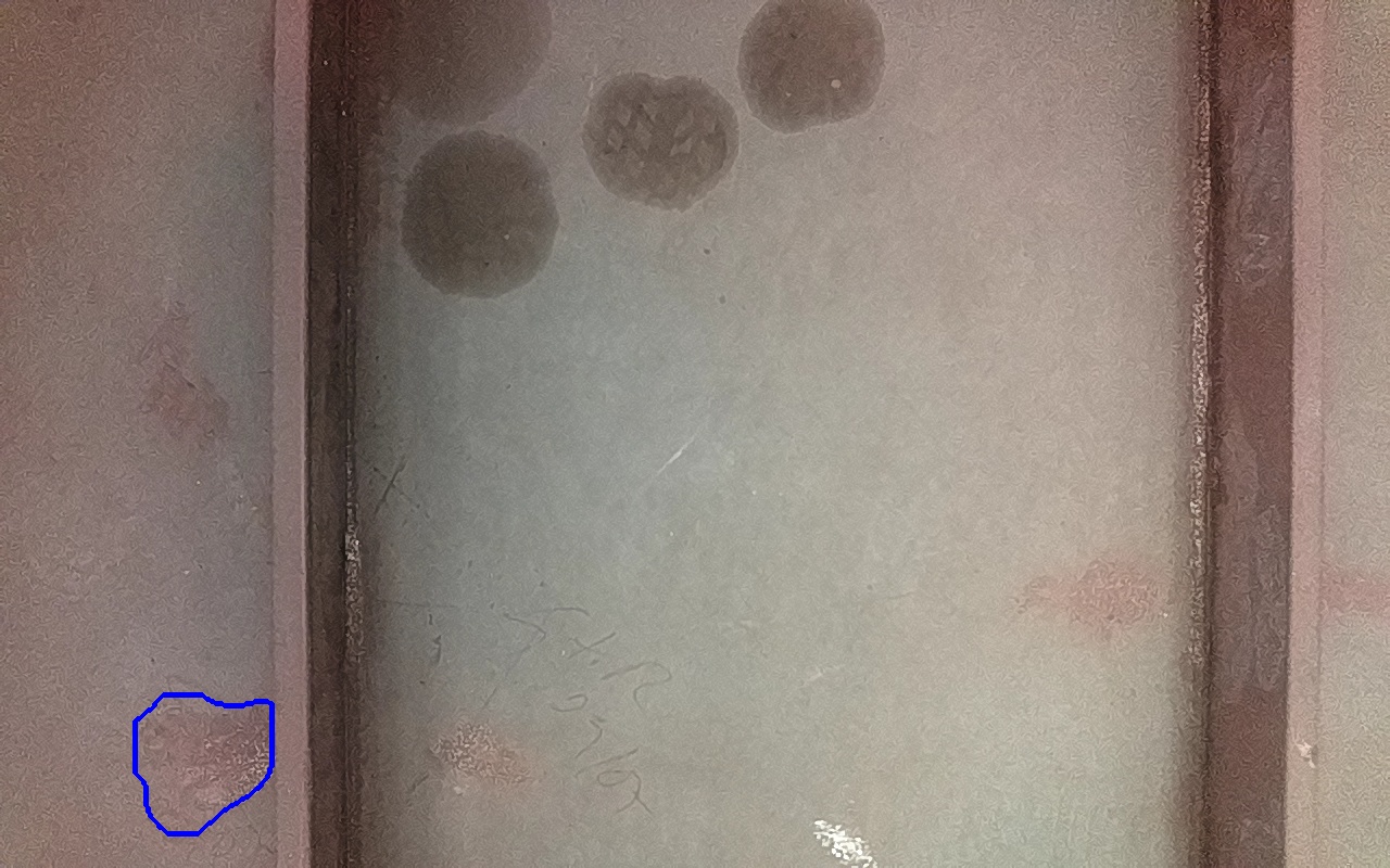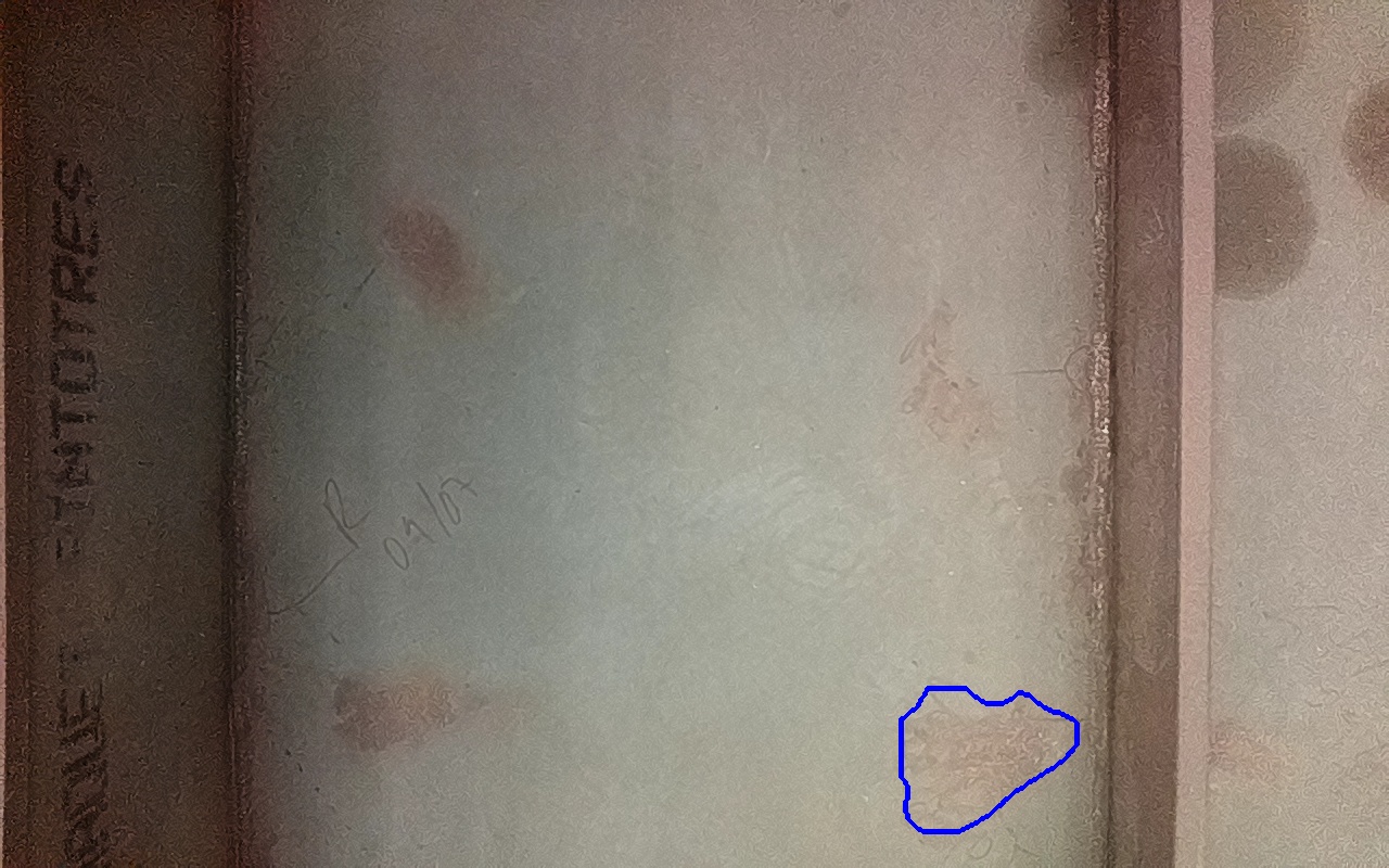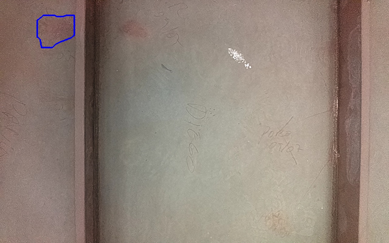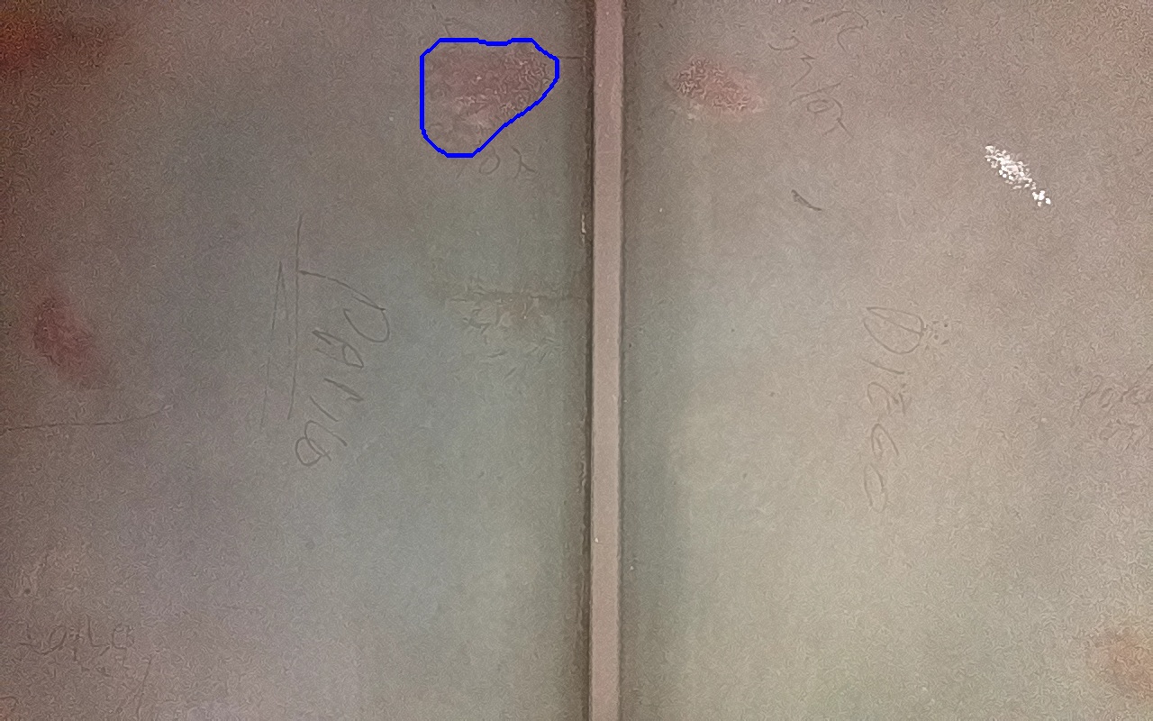 Rayaduras o zonas de metal expuestas con productos de óxido débilmente adherido.