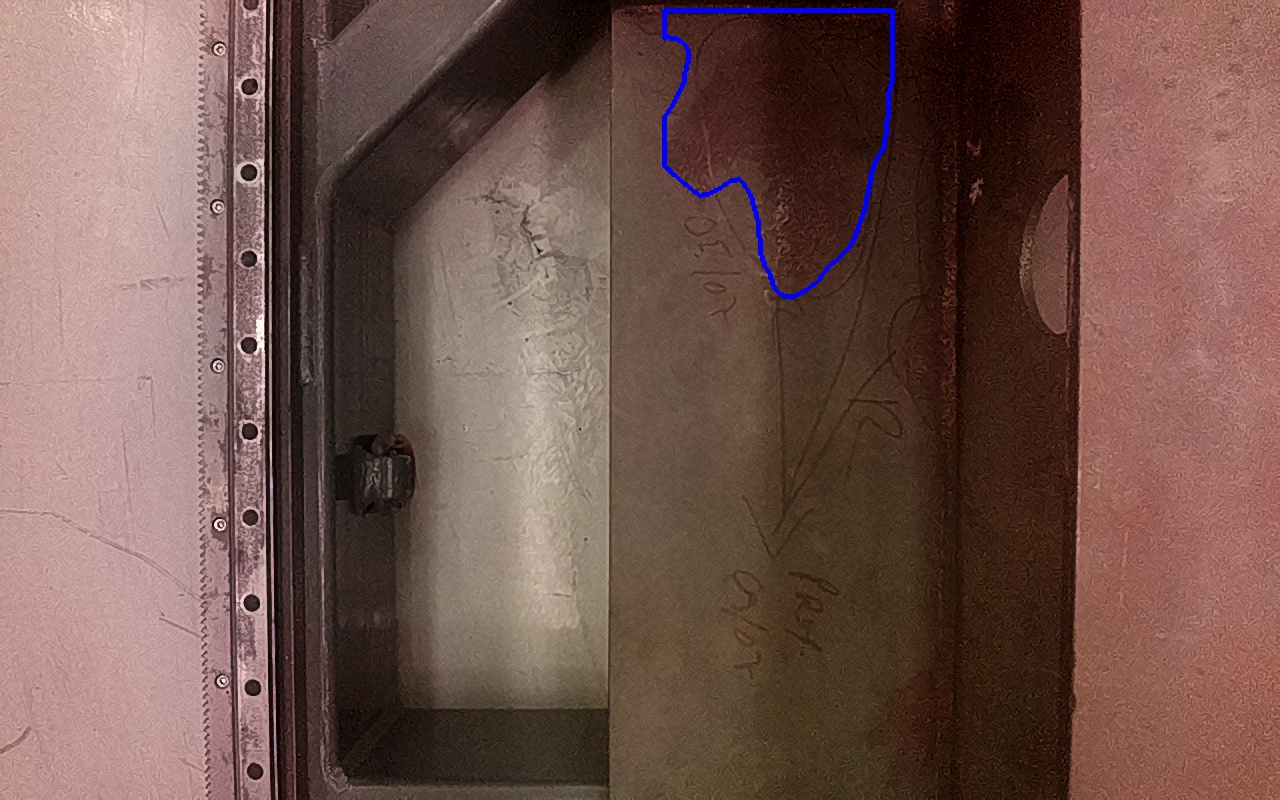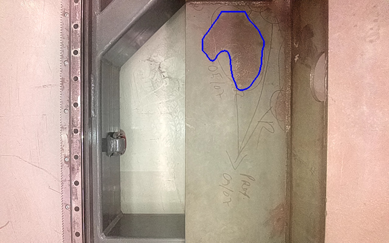 Rayaduras o zonas de metal expuestas con productos de óxido débilmente adherido.