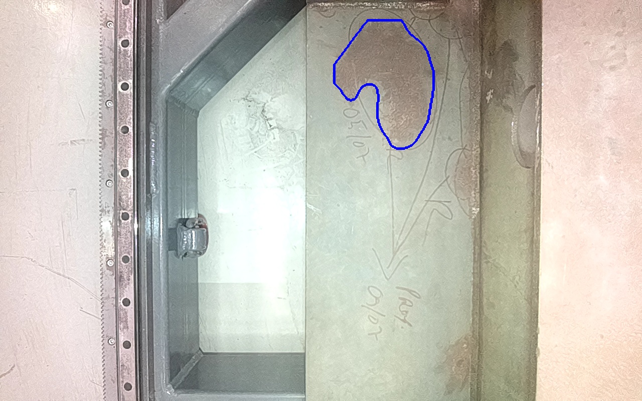 Rayaduras o zonas de metal expuestas con productos de óxido débilmente adherido.