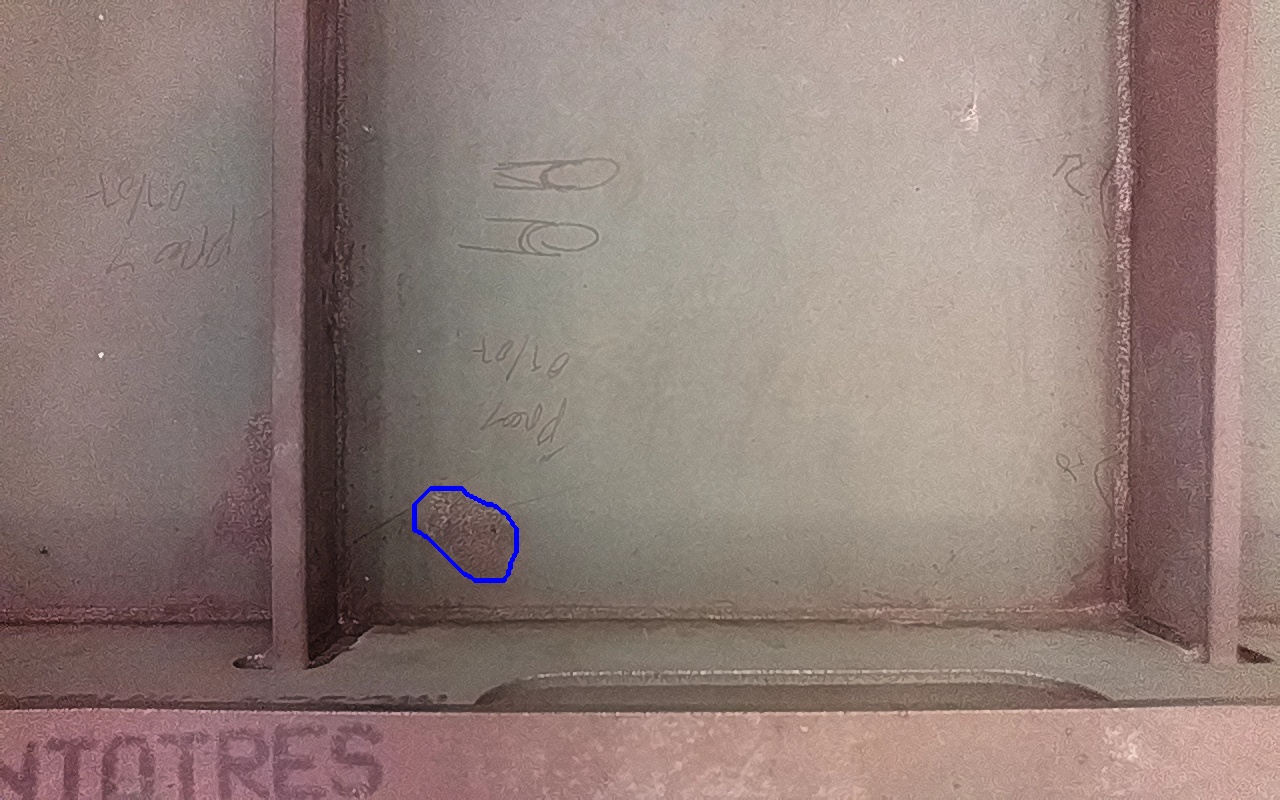 Rayaduras o zonas de metal expuestas con productos de óxido débilmente adherido.
