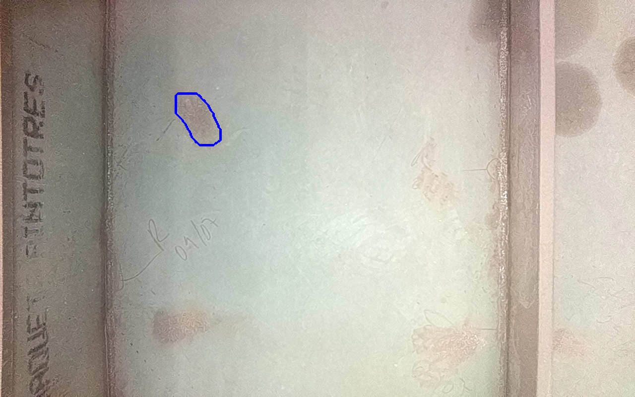 Rayaduras, marcas, daños por impacto, abrasión o zonas de metal expuestas con apariencia metálica y libre de productos de óxido o con trazas firmemente adheridas.