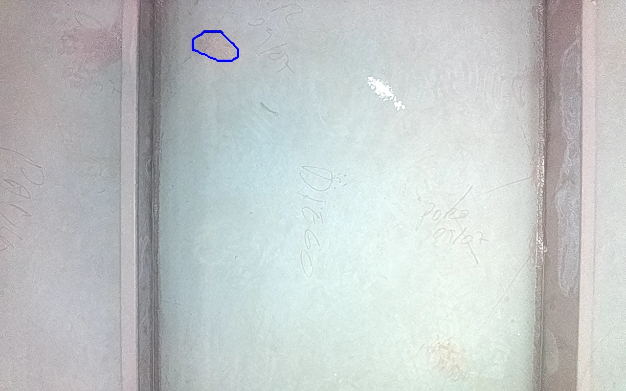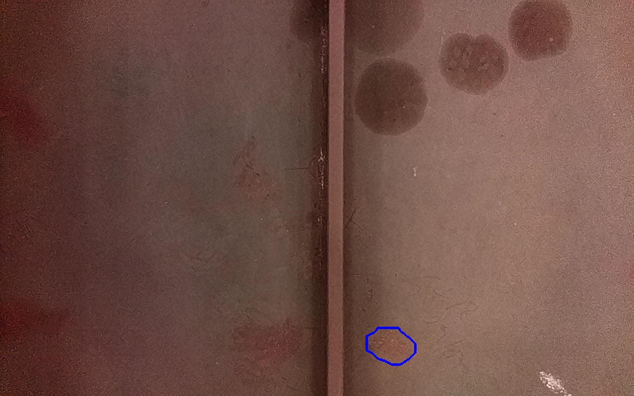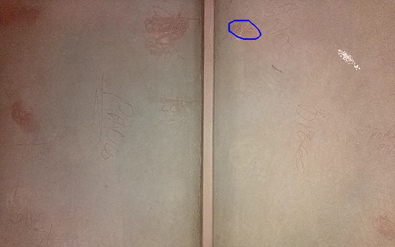 Rayaduras o zonas de metal expuestas con productos de óxido débilmente adherido.