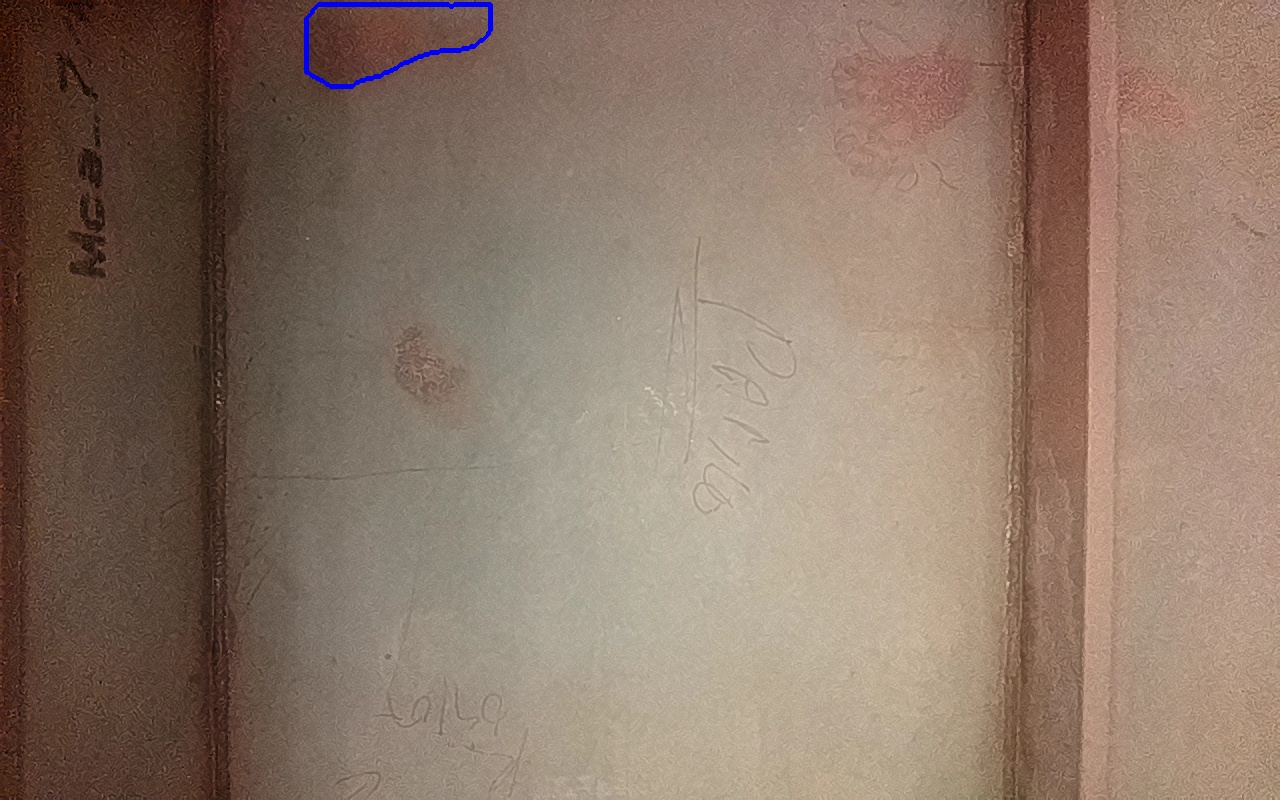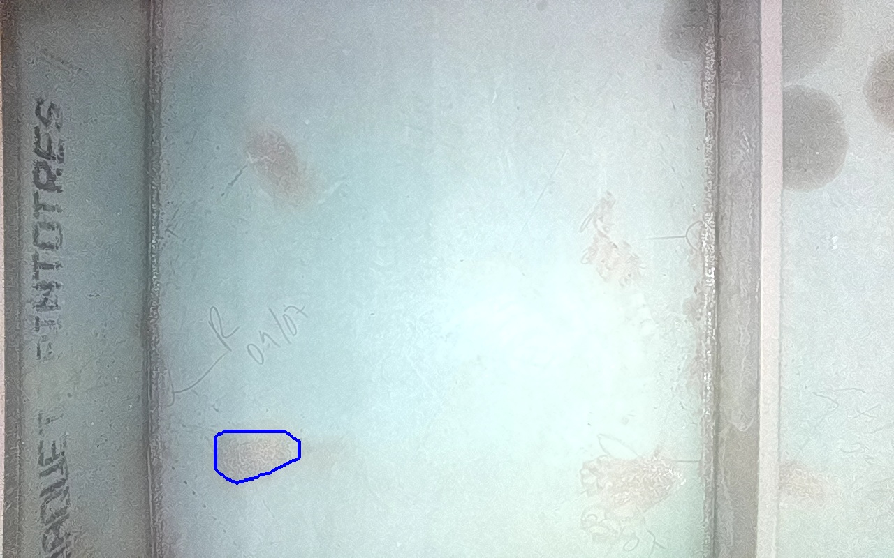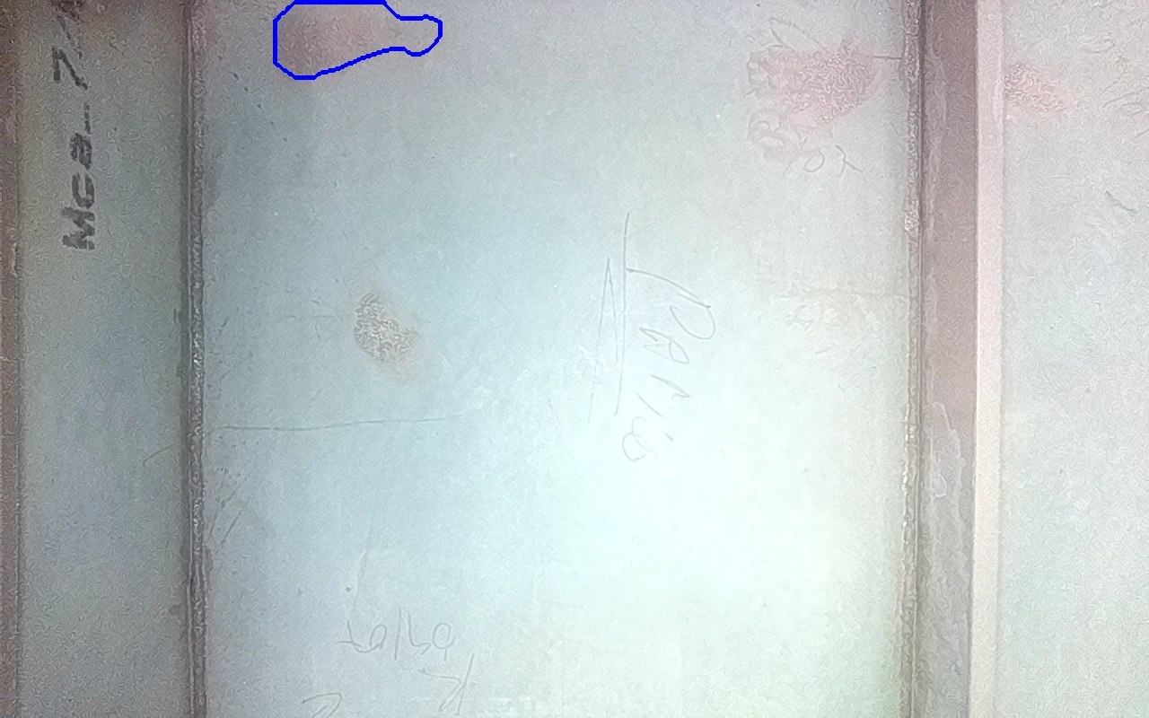 Rayaduras o zonas de metal expuestas con productos de óxido débilmente adherido.