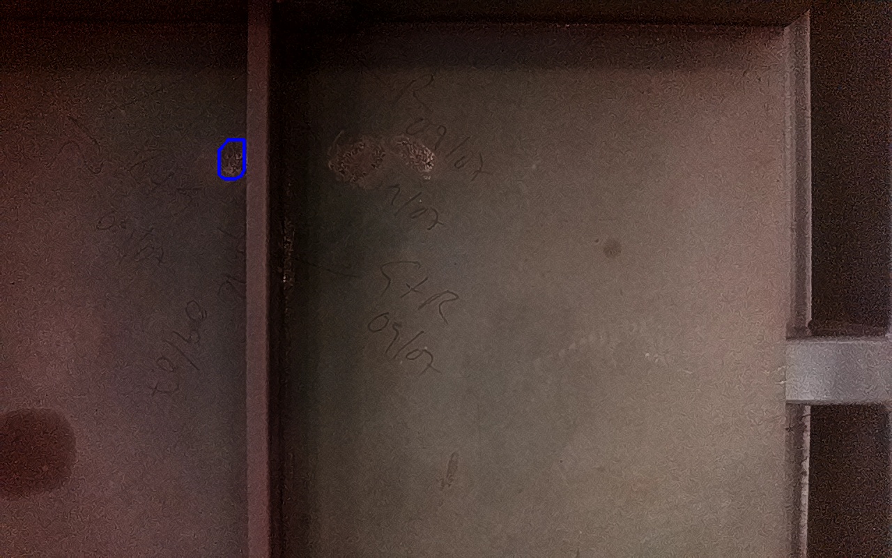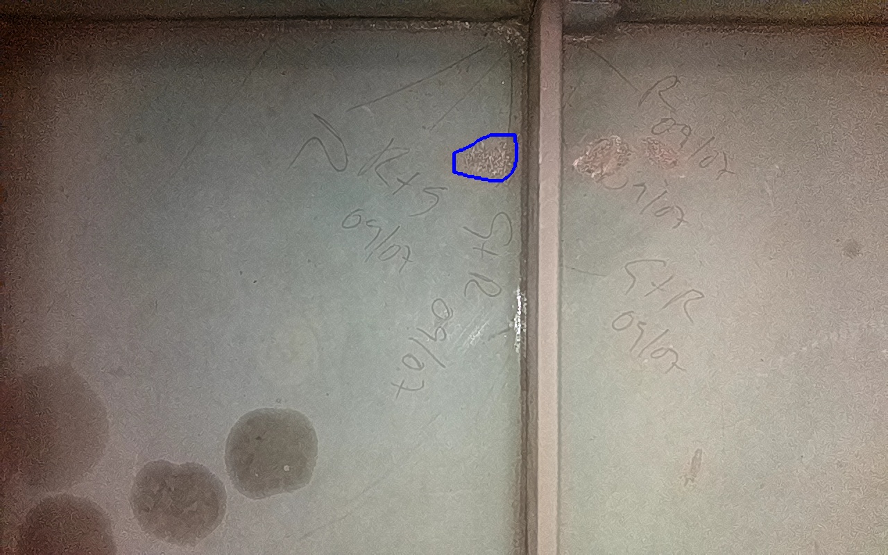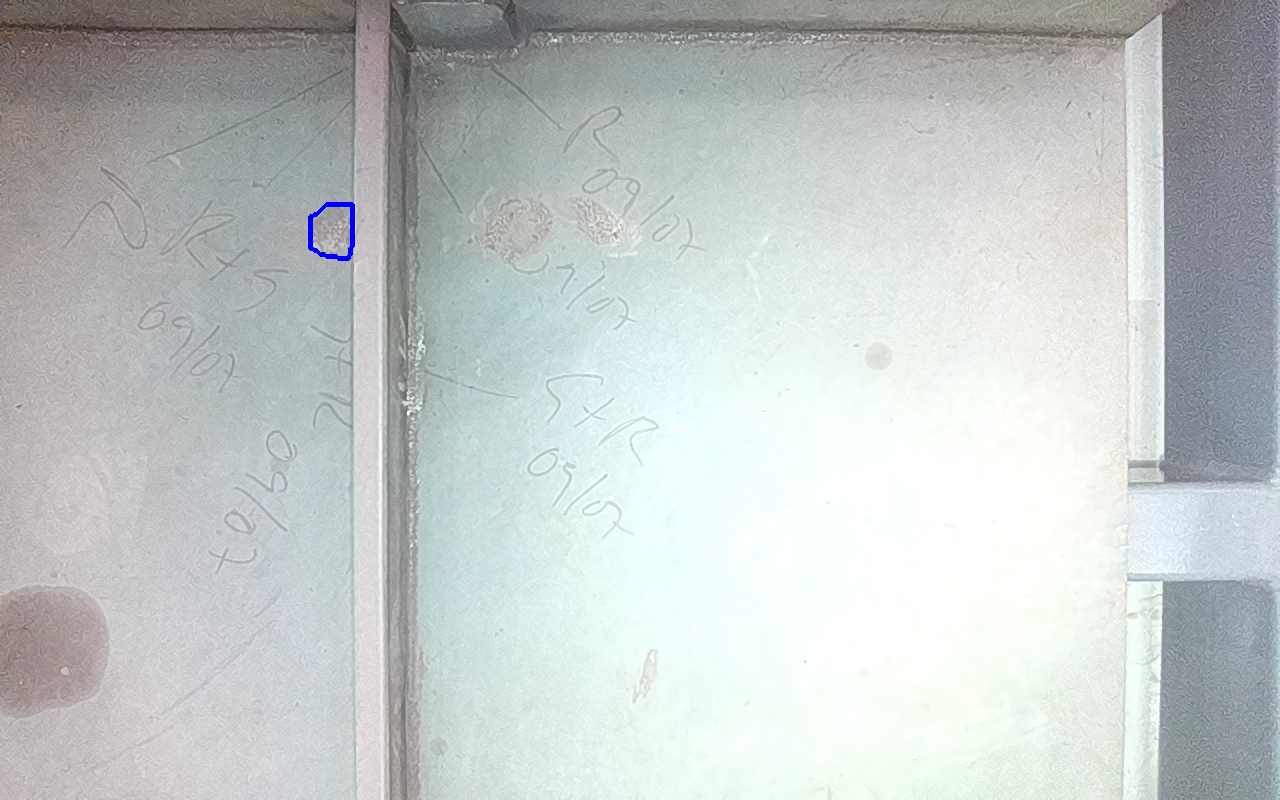 Rayaduras o zonas de metal expuestas con productos de óxido débilmente adherido.