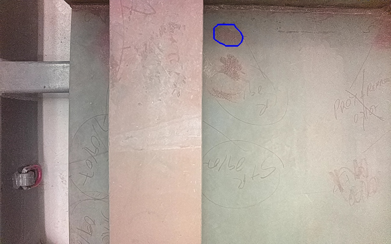 Rayaduras o zonas de metal expuestas con productos de óxido débilmente adherido.