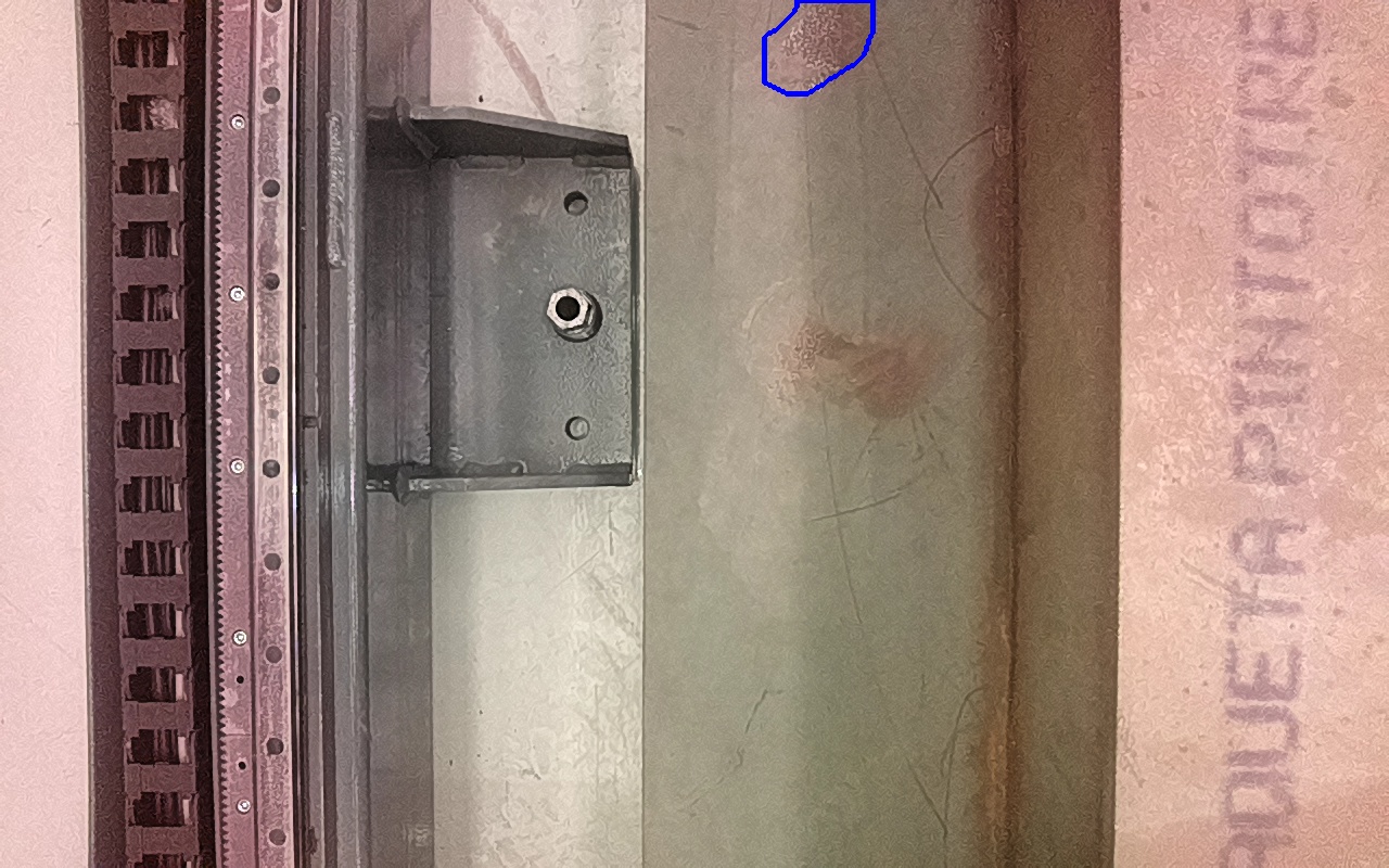 Rayaduras o zonas de metal expuestas con productos de óxido débilmente adherido.