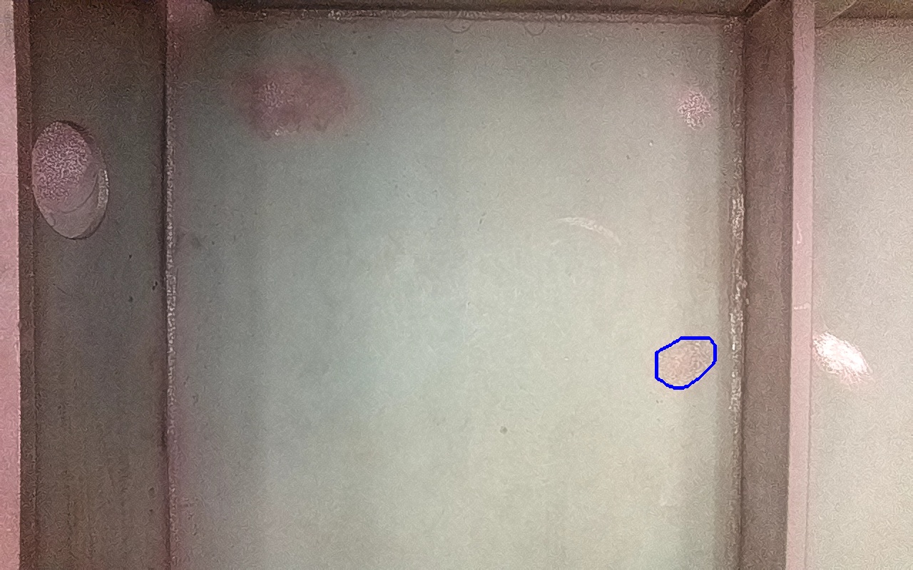 Rayaduras o zonas de metal expuestas con productos de óxido débilmente adherido.