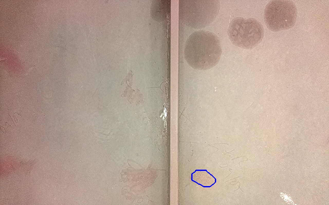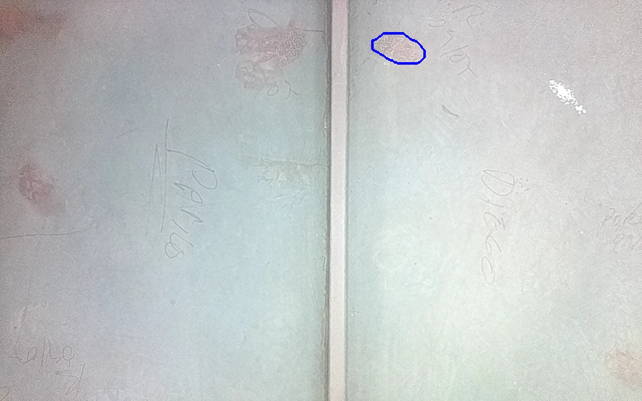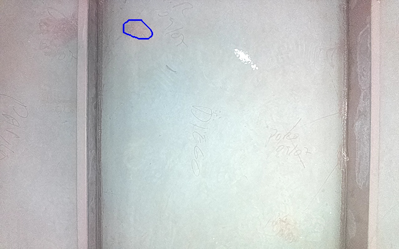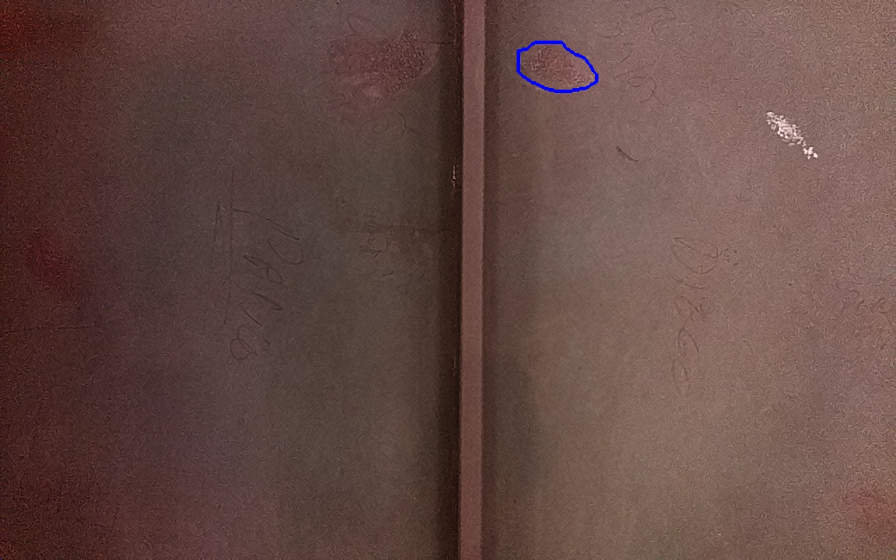 Rayaduras o zonas de metal expuestas con productos de óxido débilmente adherido.