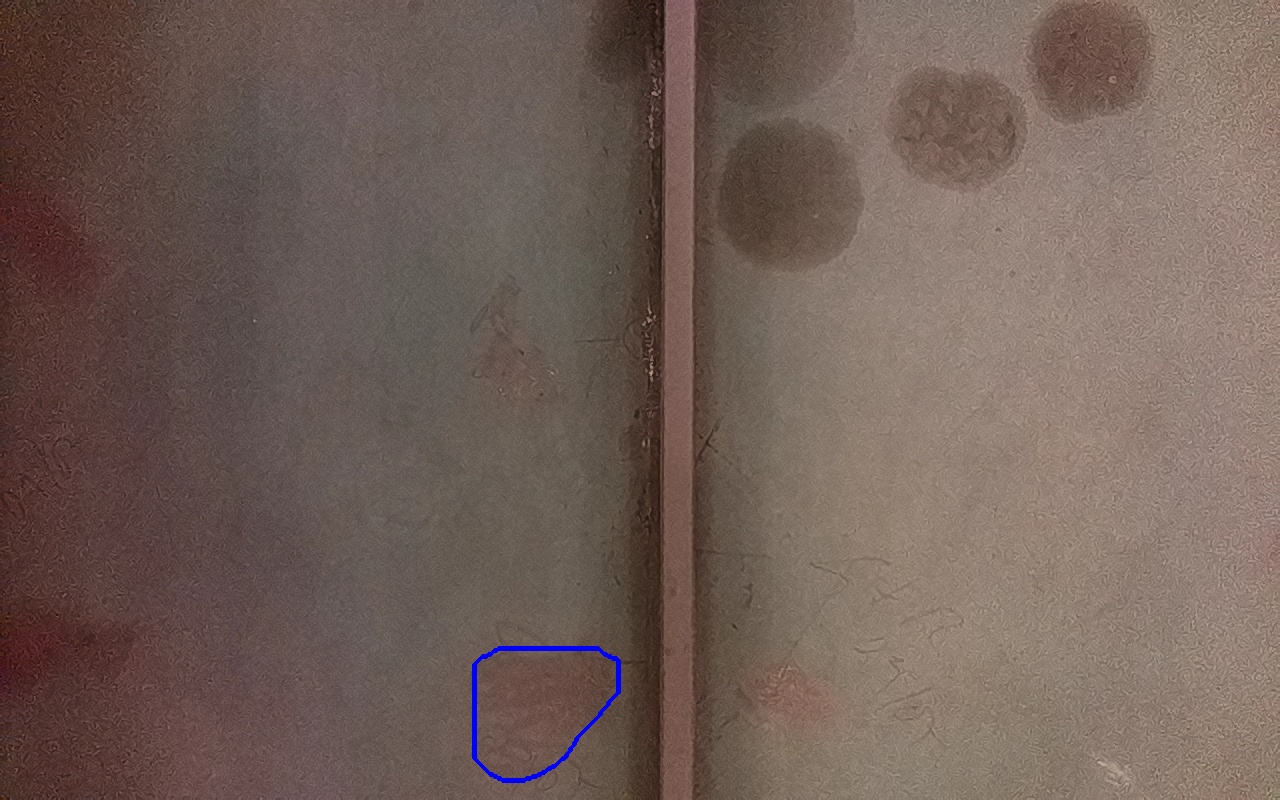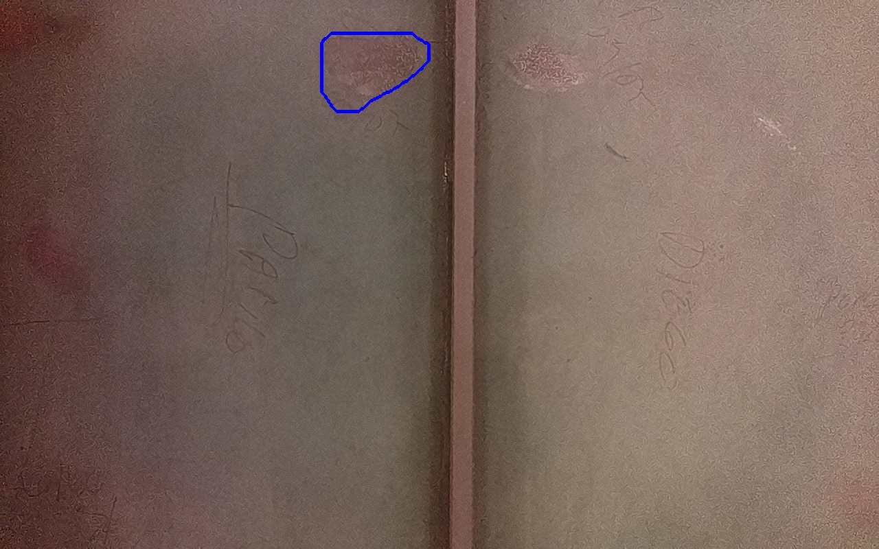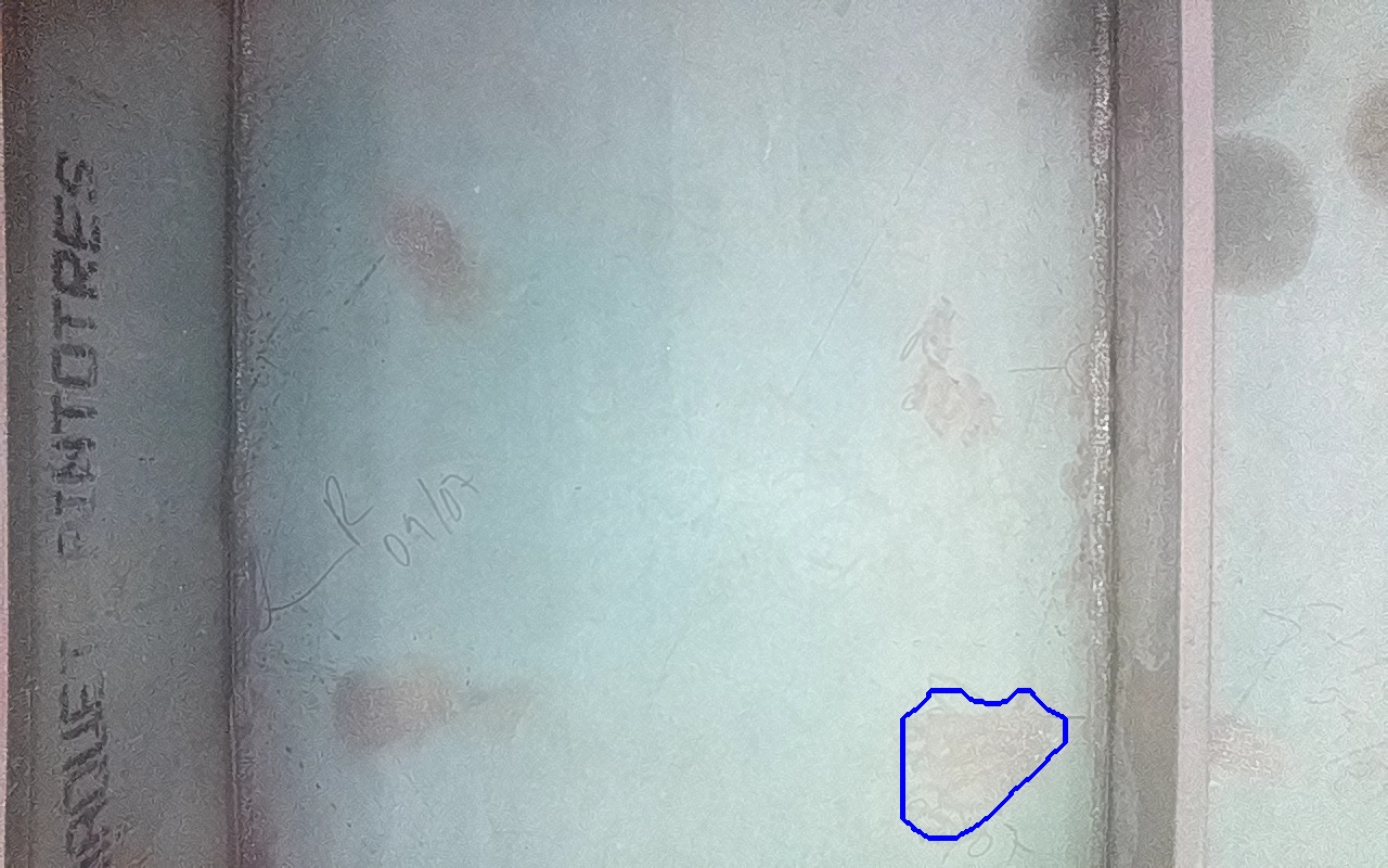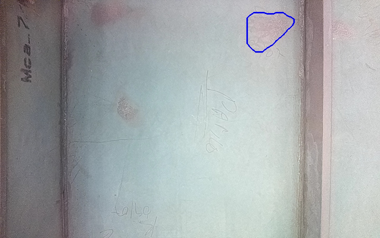 Rayaduras o zonas de metal expuestas con productos de óxido débilmente adherido.