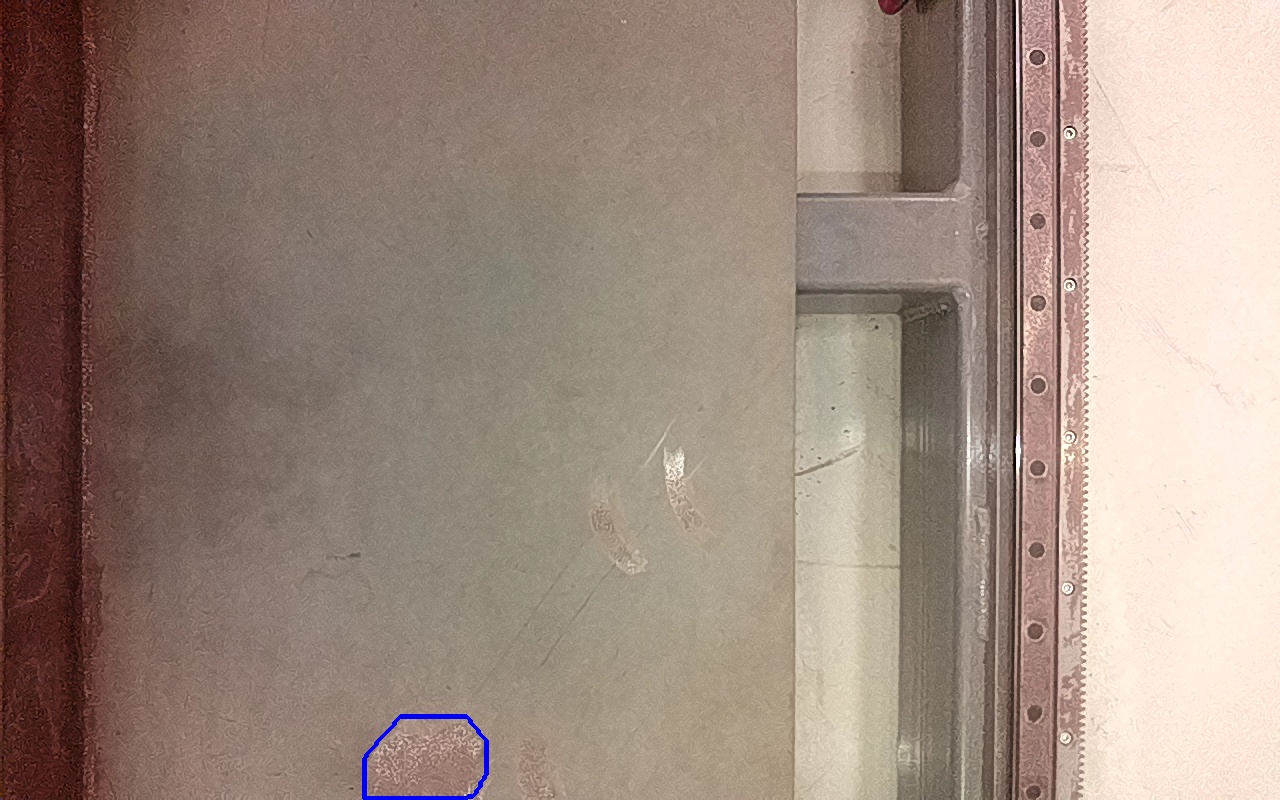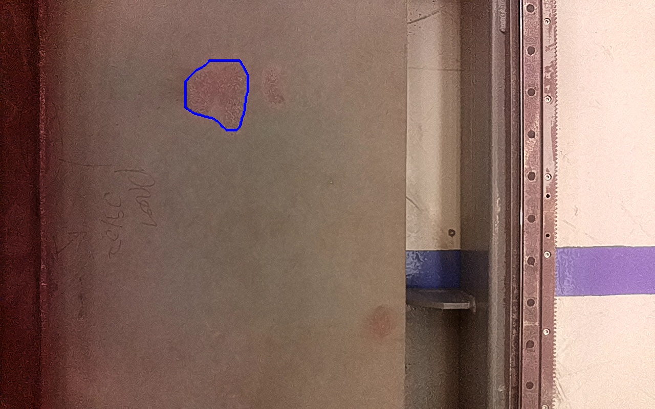 Rayaduras o zonas de metal expuestas con productos de óxido débilmente adherido.