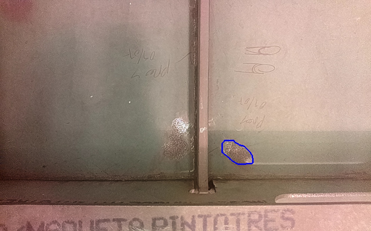Rayaduras o zonas de metal expuestas con productos de óxido débilmente adherido.